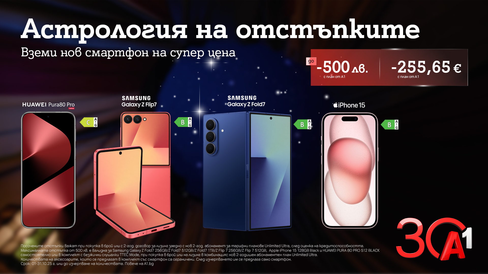 - През октомври А1 предлага смартфони на водещи производители с отстъпки до 500 лв./255,65 евро по случай своята 30-годишнина.